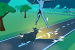 ブルランナー牛が道路で逃げる人間をはじき飛ばしながら進む暴走ゲーム。